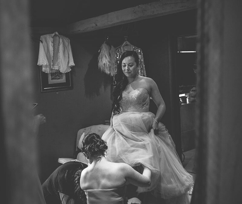 Bride putting shoes on