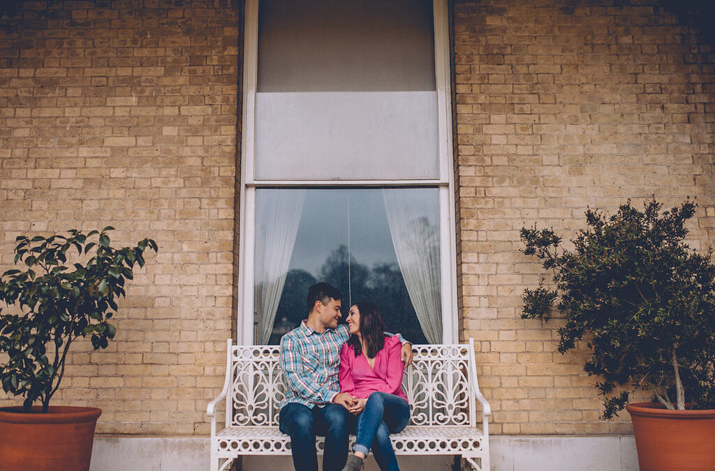 Engagement shoot sitting on bench